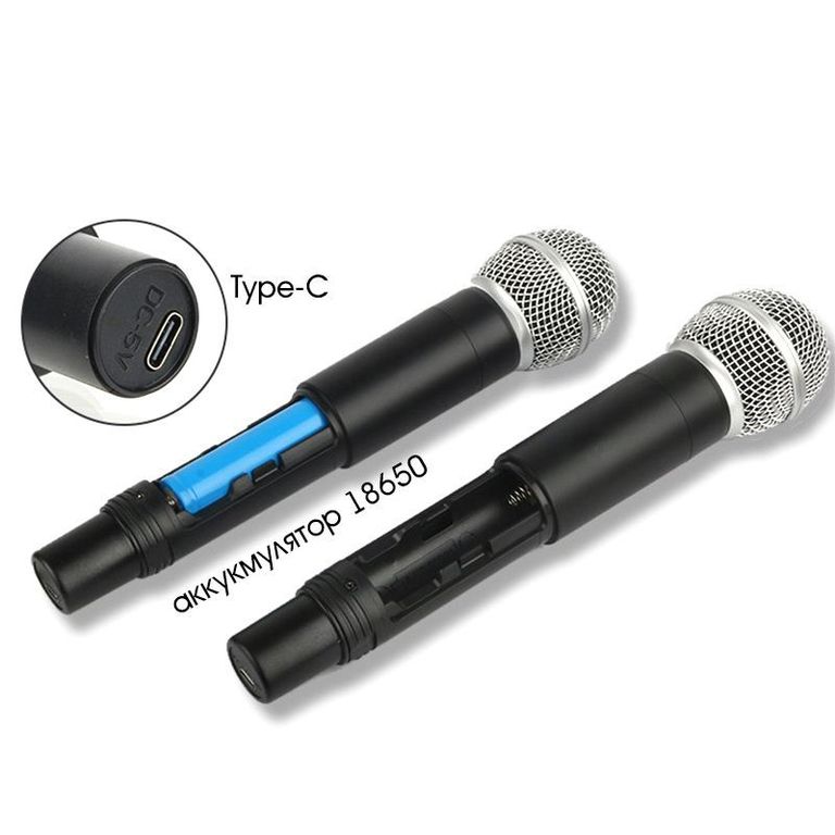 Питание микрофонов осуществляется от аккумулятора 1*18650, который входит в комплект. Электропитание приемника осуществляется от аккумулятора 1*18650, также входящего в комплект.