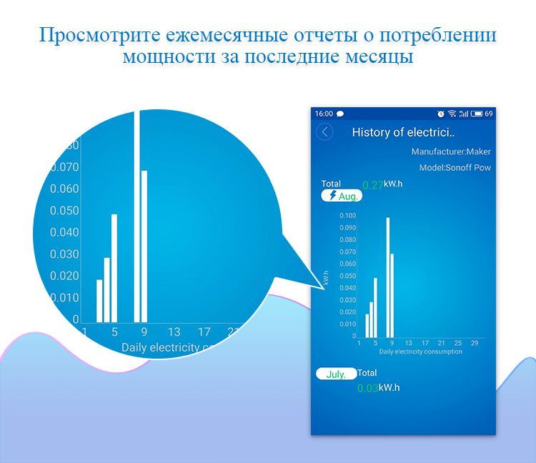 - Использование энергии. Проверяйте ежедневные и ежемесячные сводки энергопотребления через приложение