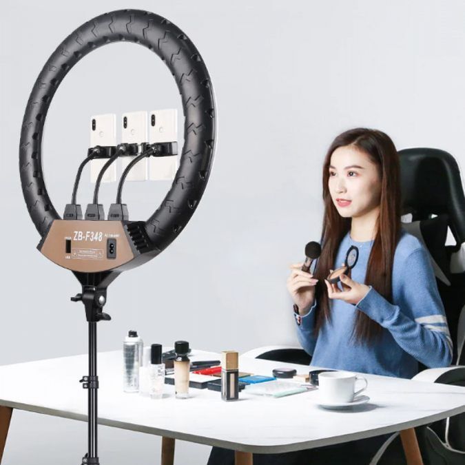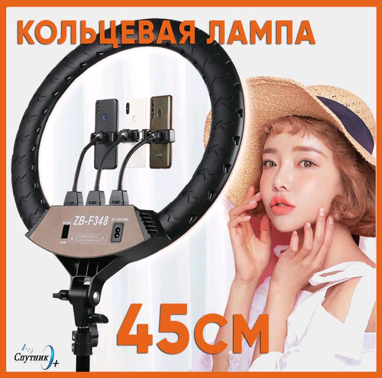 Кольцевая лампа ZBF348 одна из самых популярных ламп на рынке. Эта Led лампа сочетает в себе высокое качество сборки и материалов, а так же яркий, мягкий свет. Кольцевая лампа 45 см это идеальный диаметр лампы, он подойдет для работы (наращивание ресниц, ПМ) и для фото/видео макияжа, для ногтей, для TIK TOK и тд. Идет в комплекте с держателем для телефона, сумкой. Лампа кольцевая 45 см имеет мощность 60 ват, что в 2 ярче чем кольцевая лампа 36 см и 33 см. Есть регулировка свечения, от желтого до холодного света, лампа не RGB. Лампа для селфи имеет светодиодны нового поколения SMD 2835. Селфи лампа не мерцает и не рябит на видео, не портит зрение.