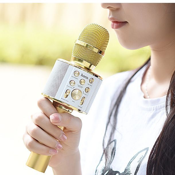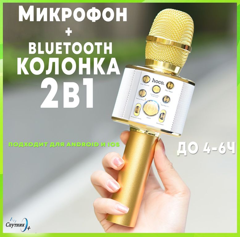 Hoco BK3 автономный караоке-микрофон со встроенной колонкой. С ним Вы сможете петь караоке где-угодно: дома, на пикнике или на корпоративе. Аксессуар поддерживает воспроизведение аудиофайлов с карты памяти формата micro-SD, а также подключается к смартфону, планшету или другому устройству с помощью аудио кабеля или через Bluetooth.