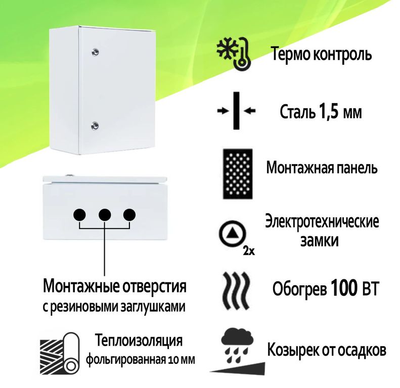 Термошкаф предназначен для монтажа электронного оборудования, требующего защиты от воздействия низких температур, пыли, влаги, атмосферных осадков, нежелательного доступа и других неблагоприятных факторов.