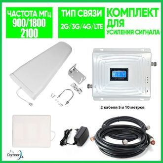 - Комплект для усиления сигнала сотовой связи и интернета 2G/3G/4G (LTE) на частотах 900/1800/2100 МГц, с большой площадью покрытия. Данный комплект рекомендуется использовать в помещениях объектов, где сигнал плохой или отсутствует, а на улице приемлемый или хороший. • Улучшает прием сотовой связи МТС, Билайн, Мегафон, ТЕЛЕ2. • Комплектуется внешней направленной широкополосной антенной с усилением от 9 до 11 дБ, внутренней компактной панельной антенной с усилением до 10 дБ и стандартов 2G;3G;4G;LTE;LTE 1800;GSM 900;GSM 1800 GSM 2100