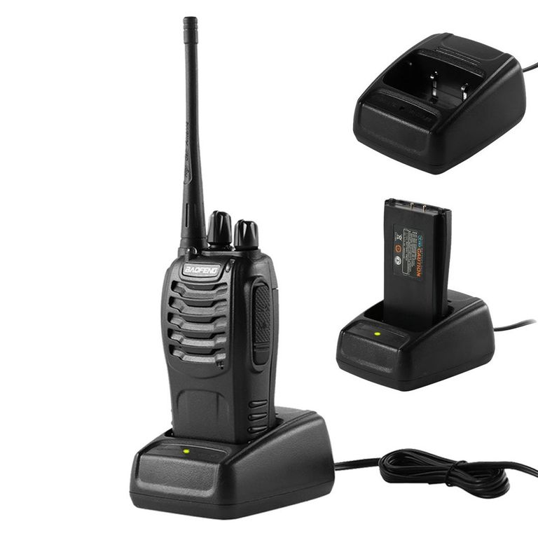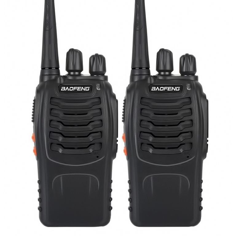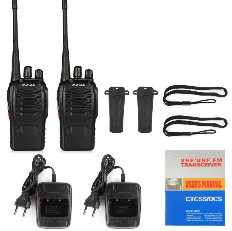 Комплектация: радиостанция 2шт, аккумулятор 2шт, антенна 2шт, ремешок на кисть руки 2шт, клипса на пояс 2шт, зарядный стакан 2шт, инструкция на Английском