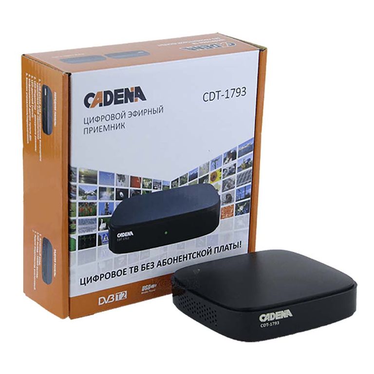 Цифровой эфирный приёмник CADENA CDT-1793 со встроенным тюнером DVB-T2 предназначен для приёма открытых каналов эфирного вещания высокой четкости. Дальность и качество приёма зависит от места установки приёмной антенны, мощности передатчика, рельефа местности, времени года, уровня помех и других факторов.