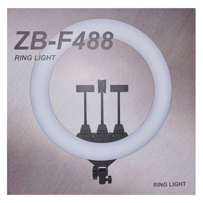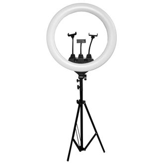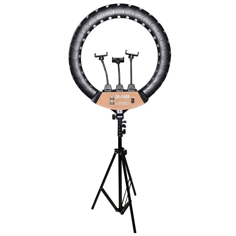 Комплектация: кольцевая лампа, 3 гибких держателя для телефона, сетевой кабель, пульт управления, сумка-переноска, штатив