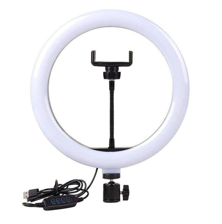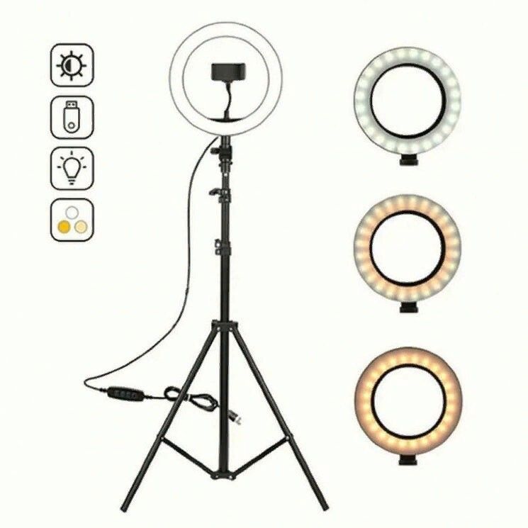 Светодиодная кольцевая лампа - это бюджетный вариант профессионального освещения, доступный каждому. Если Ваша работа связана с фото или видеосъемкой, кропотливой деятельностью, требующей внимательности, то такая лампа станет для Вас незаменимым аксессуаром.? Лампа отлично подходит для фотосъемки, как портретной, так и предметной.? Основное достоинство лампы - это возможность регулировки температуры света. В комплекте идет держатель телефона на гибком креплении, который подходит для большинства смартфонов шириной от 5,2 до 10,5 см.