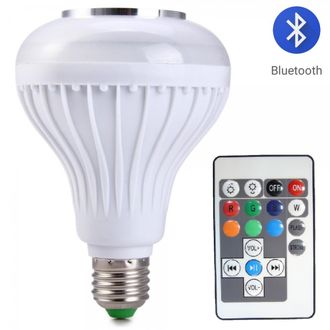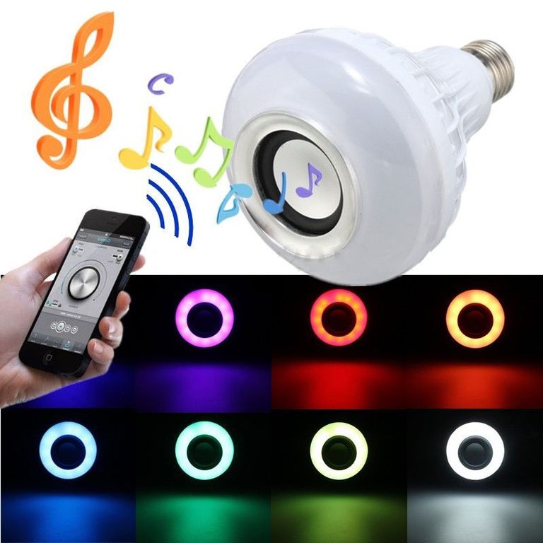 Светодиодная лампа имеет обычный цоколь E27 как на обычной лампочке 220v. Пультом можно управлять цветом, яркостью и режимами. А главная фишка в том, что лампочка имеет встроенный динамик мощностью 3 Вт. С телефона можно подключится к лампочке через BLUETOOTH и слушать музыку. Таким образом лампу можно использовать как удобный ночник с регулируемой яркостью или как музыкальную колонку со светомузыкой.