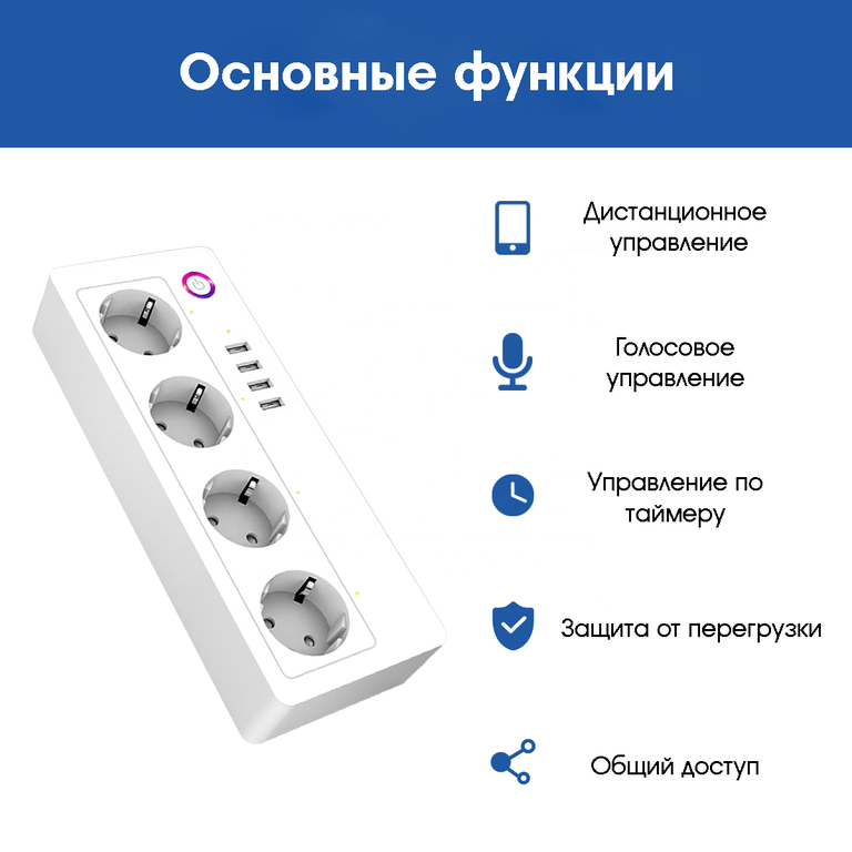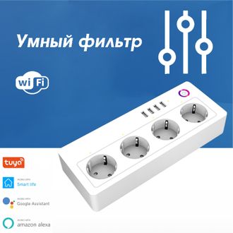 Работает с приложениями: Smart Life, Tuya Smart, Amazon Alexa, Google Assistant. Интеграция в Яндекс Алиса. (розетки управляются отдельно каждая, также отдельное управление на все 4*USB одновременно)